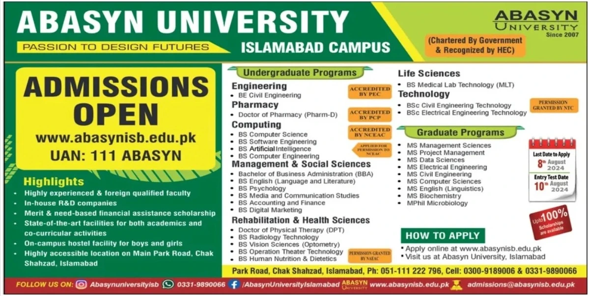 Abasyn University Islamabad is a private-sector university recognized by the Higher Education Commission (HEC) of Pakistan. Abasyn Abasyn University Islamabad Admissions are now open for various undergraduate, graduate, and postgraduate programs. Prospective students can apply online and must meet the eligibility criteria for their desired courses. For more details, visit the university’s official website.