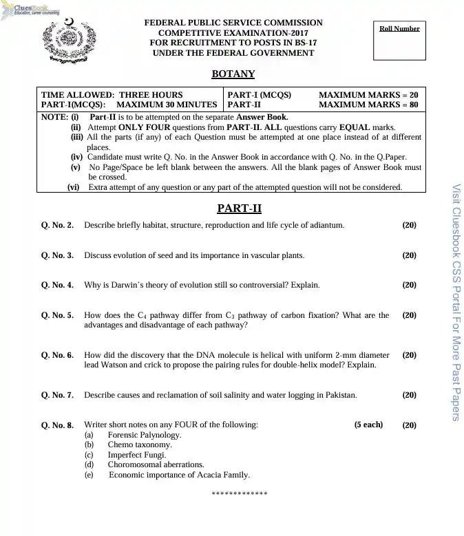 Download Botany past papers CSS 2017 PDF to prepare effectively; for example, practice diagrams and short notes from this paper to strengthen your exam revision.