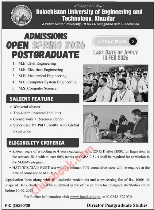 Balochistan University of Engineering and Technology Khuzdar has announced admissions for the 2026 academic session in multiple undergraduate and postgraduate disciplines. Eligible candidates are encouraged to apply early to ensure consideration on merit.