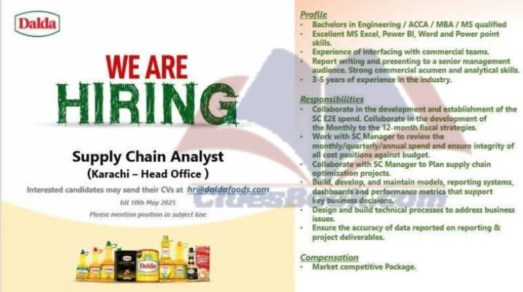 Apply for Dalda Foods Jobs in 2025 as a Supply Chain Analyst in Karachi. Apply by May 10, 2025. Competitive package, growth opportunities.