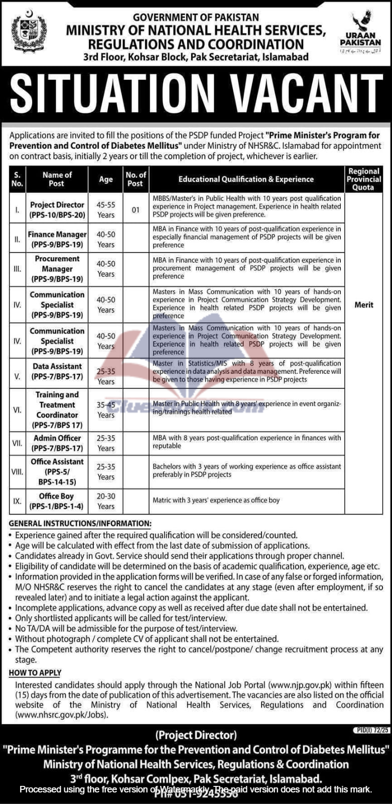The Ministry of National Health Services, Regulations & Coordination (NHSR&C) invites applications for various project-based positions under the Prime Minister’s Program for Prevention and Control of Diabetes Mellitus.