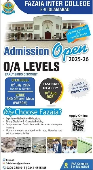 Apply now for Fazaia Inter College Admissions Open for O/A Levels 2025-26. Limited seats, early bird discounts, and merit based benefits.
