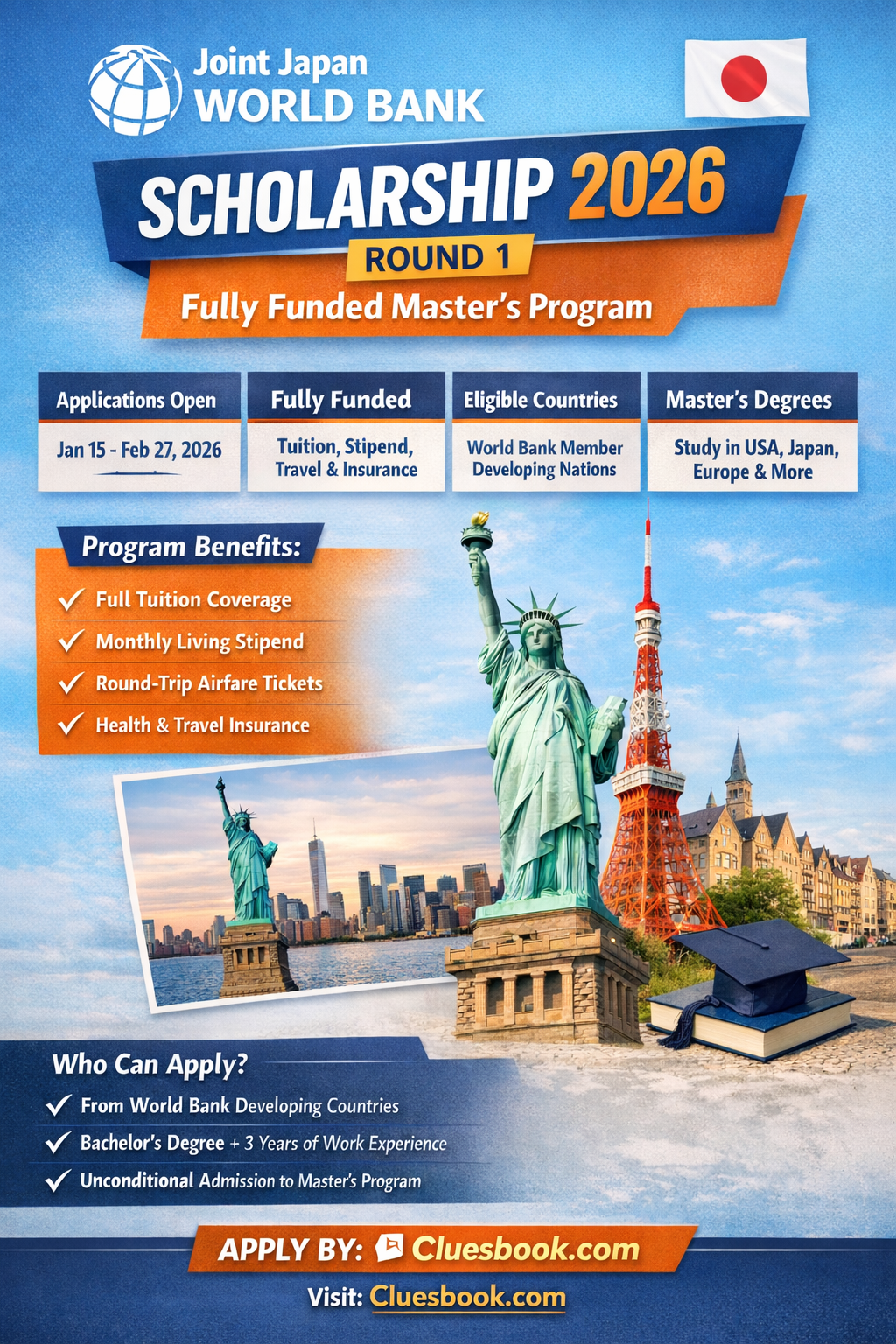 The Joint Japan World Bank Scholarship 2026 Round 1 is now open for applications. This fully funded scholarship supports students from developing countries to pursue a Master’s degree at top international universities. It is one of the most competitive and prestigious scholarships for development professionals worldwide.