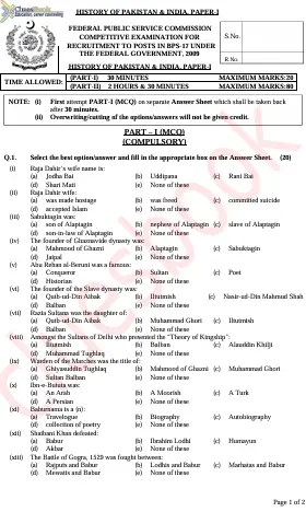 History of Pakistan and India Past Papers CSS 2009 Overview