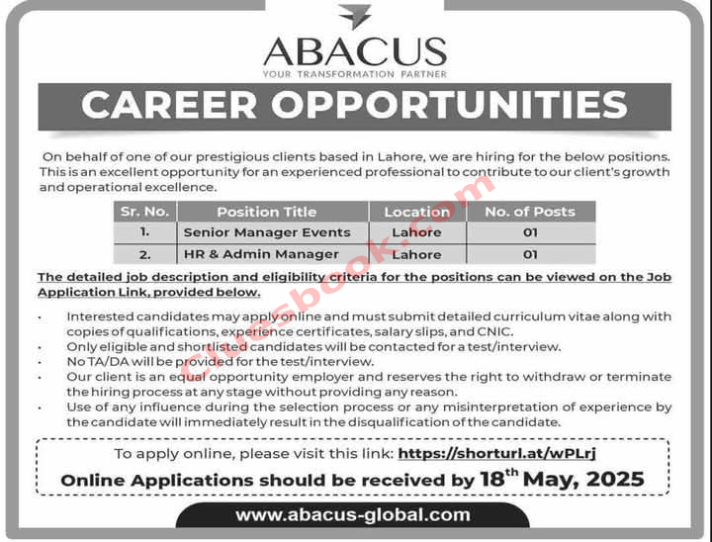 Advertisement For ABACUS Global Jobs in Lahore: