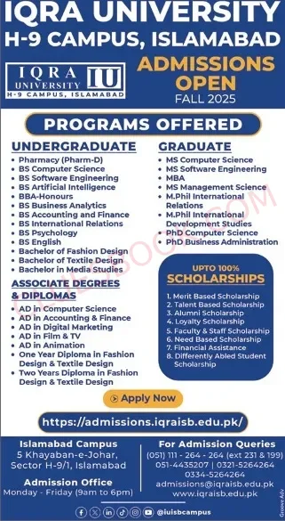 - Iqra University admissions in Islamabad for Fall 2025 are now officially open. Interested students are encouraged to submit their applications as soon as possible to increase their chances of selection and scholarship consideration.