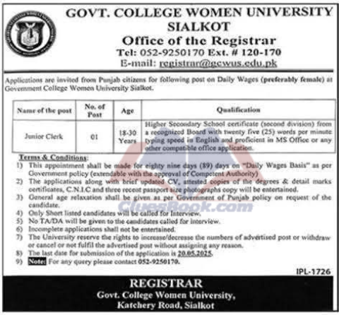 Advertisement for Junior Clerk Job at the Govt. College Women University