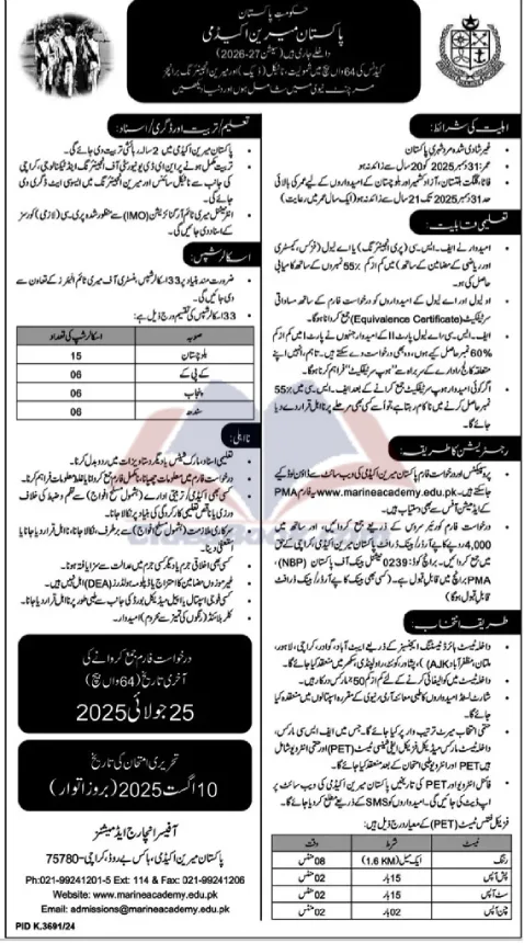 - Admissions for the 64th batch of Nautical and Engineering Cadets at the Pakistan Marine Academy are officially announced and are now open for online applications.