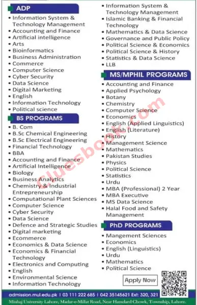 Minhaj University Lahore is currently accepting applications for Associate Degree Programs (ADP), BS, MS/MPhil, and PhD programs in trending and in-demand fields such as Artificial Intelligence, Cyber Security, Psychology, Management Sciences, and more.