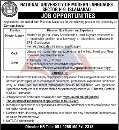 NUML University Islamabad is offering contract-based employment opportunities for various roles. Below are the details of each position: