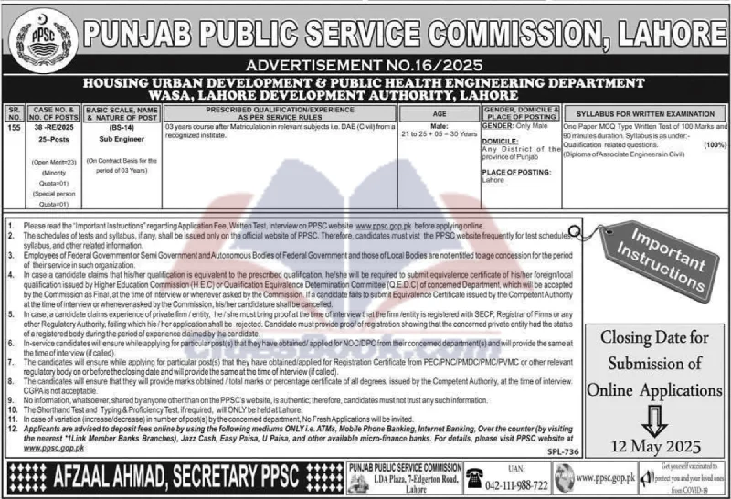 The Punjab Public Service Commission (PPSC) is a reputable government body responsible for recruiting civil servants across Punjab. This sub-engineer recruitment is for WASA Lahore, under the Lahore Development Authority, which manages water and sanitation services. Working here ensures job stability, career growth, and a chance to serve the public. PPSC ensures transparent, merit-based selection under the Housing, Urban Development, and Public Health Engineering Department.
