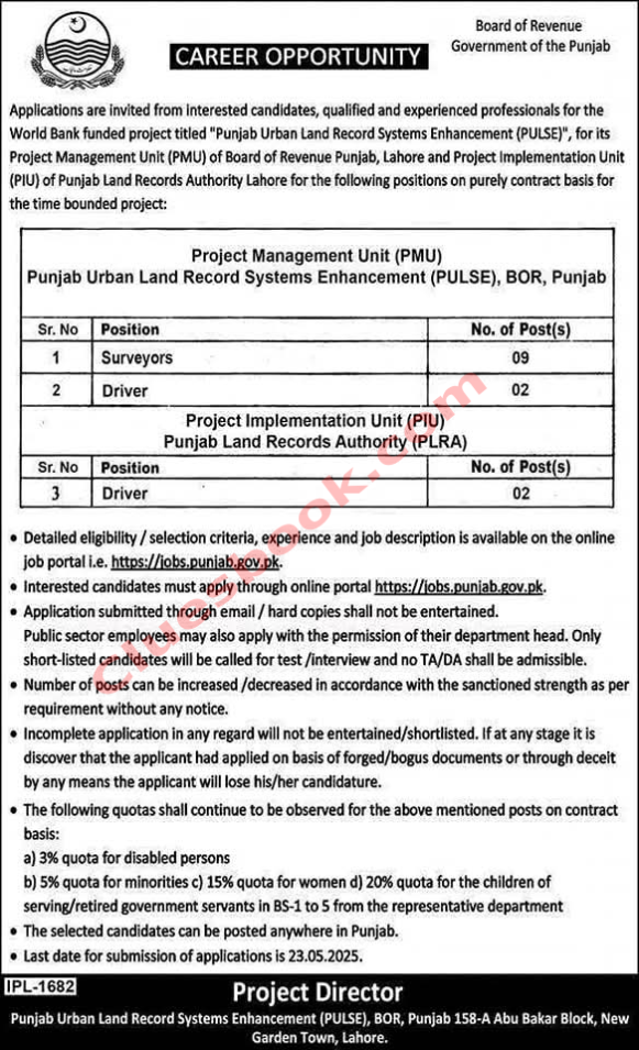 Apply now for Punjab Land Records Jobs 2025 for Surveyor & Driver posts. Government contract jobs with strong benefits.Application Deadline: May 23, 2025.