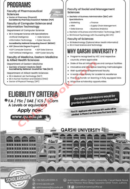 Qarshi University Admissions Fall 2025 are now open! Explore top programs in Pharma, IT, Business, and Health. Apply online now before the deadline: July 12, 2025.