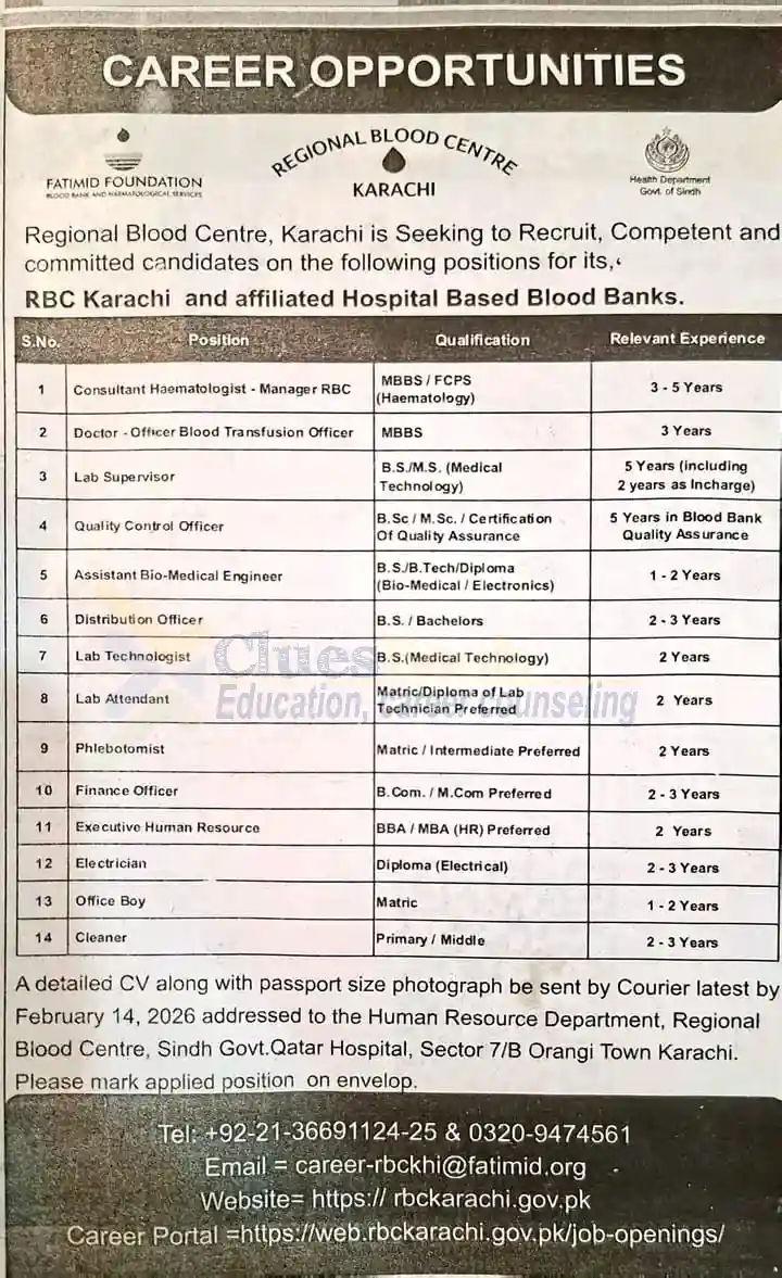 Apply for Regional Blood Centre Karachi jobs 2026. Multiple medical, technical, and support staff vacancies available. Last date: February 14, 2026.