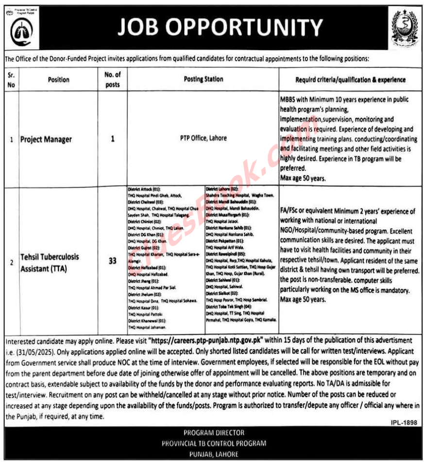 Great news for passionate individuals ready to work in Pakistan’s public health sector! The Provincial TB Control Program, Punjab, has announced contract-based positions under a donor-funded project. This is your chance to make a real difference while building a professional and respected career.