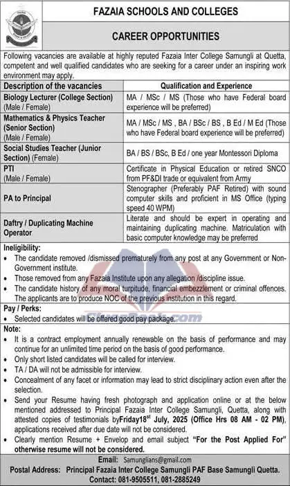 Fazaia Inter College Samungli Quetta Jobs 2025 offer teaching and non-teaching vacancies including positions for Biology Lecturers, Math & Physics Teachers, Social Studies Teachers, PTIs, and administrative staff such as PA to Principal and Daftry/Machine Operators. Both male and female candidates can apply. Applicants must have relevant qualifications, and Federal Board experience is preferred. These are contract-based jobs with a performance-based extension. Applications can be submitted by hand or courier to the principal’s office at PAF Base Samungli, Quetta.