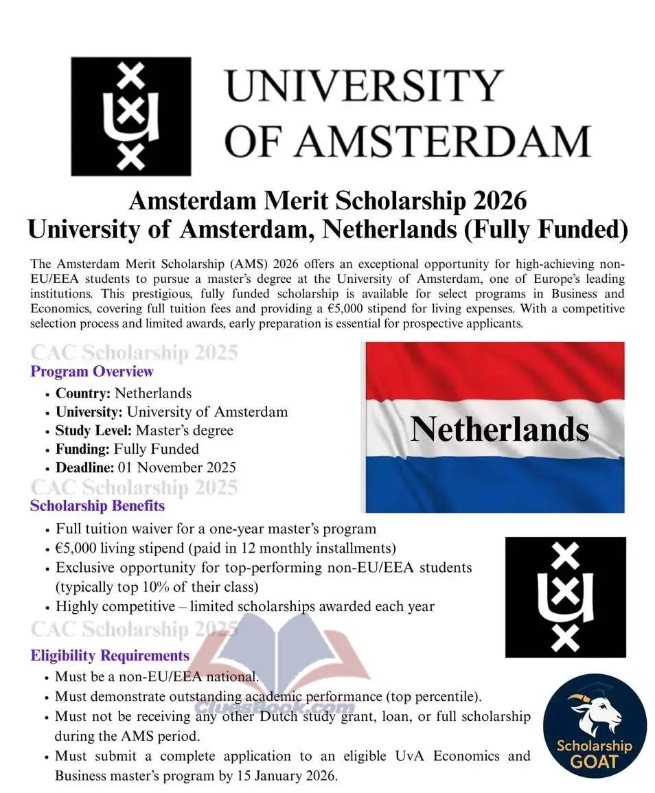 - The University of Amsterdam Scholarship 2026 is currently open for applications, and interested students should begin their application process well before the deadlines to ensure eligibility and secure a supervisor, where applicable.