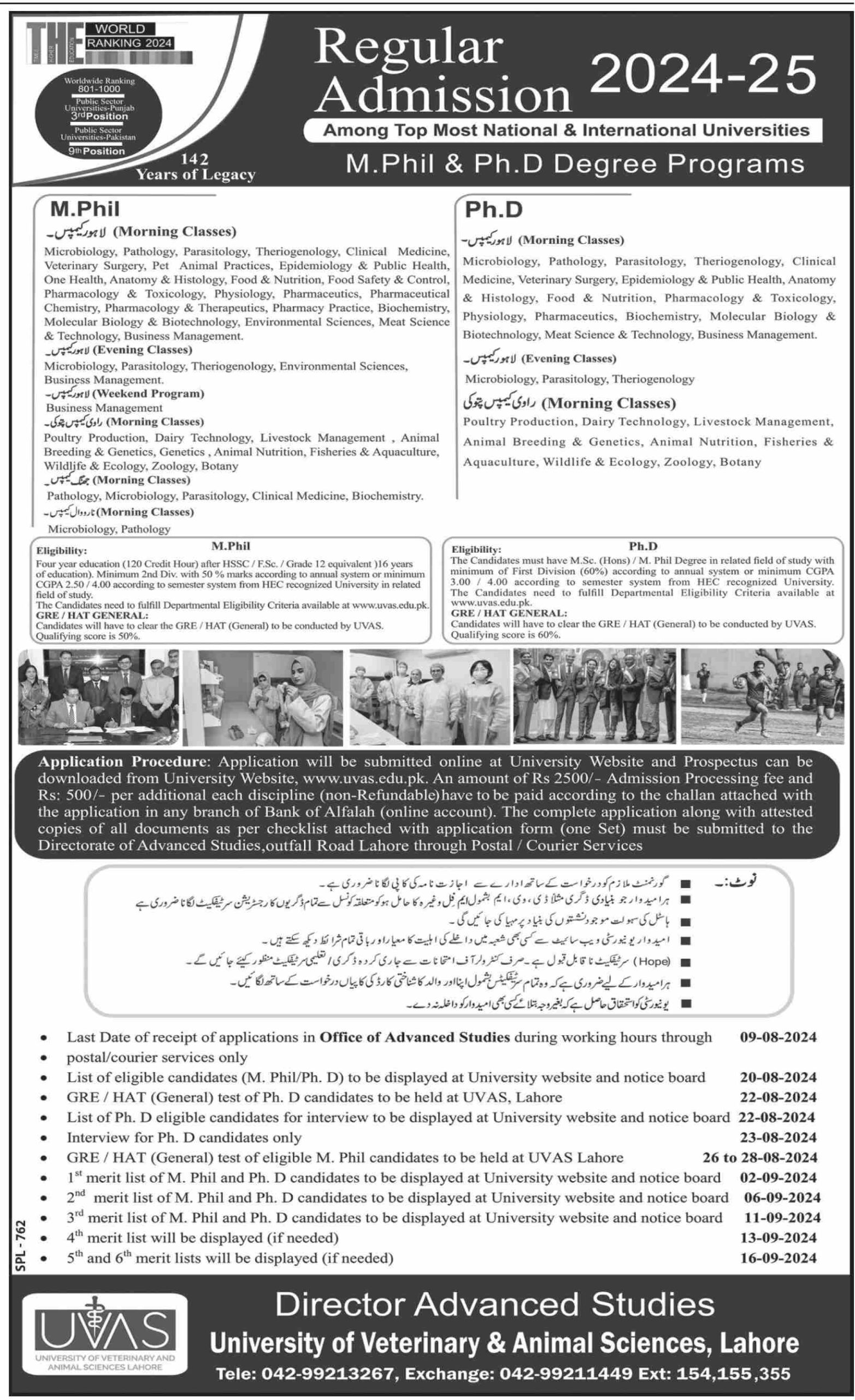 - Online Application: Candidates must apply online through the UVAS admission portal.